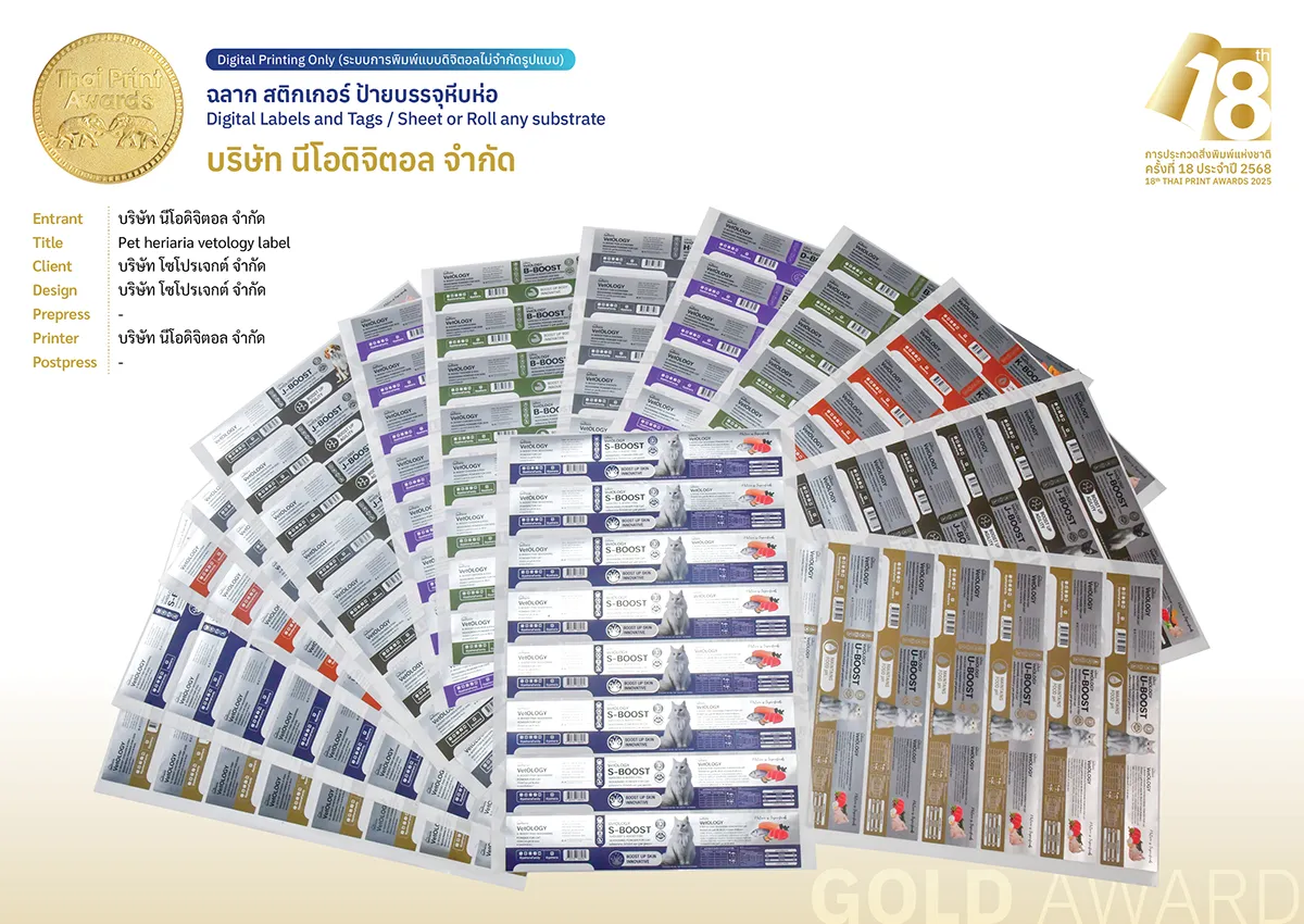 Entrant: บริษัท นีโอดิจิตอล จำกัด Title: Pet heriaria vetology label Client: บริษัท โซโปรเจกต์ จำกัด Designer: บริษัท โซโปรเจกต์ จำกัด Prepress: – Printer: บริษัท นีโอดิจิตอล จำกัด Postpress: –