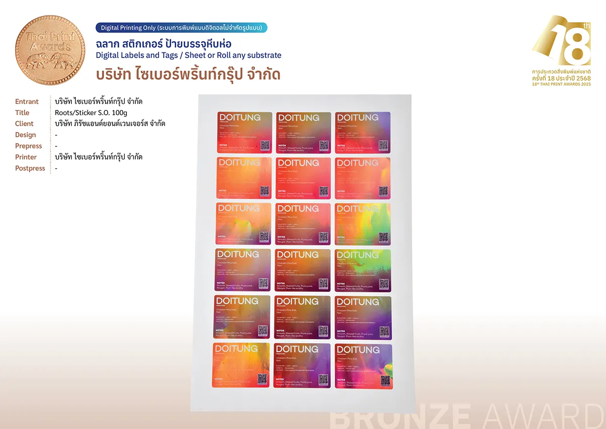 Entrant: บริษัท ไซเบอร์พริ้นท์กรุ๊ป จำกัด Title: Roots/Sticker S.O. 100g Client: บริษัท ภิรัชแอนด์ยอนด์เวนเจอร์ส จำกัด Designer: – Prepress: – Printer: บริษัท ไซเบอร์พริ้นท์กรุ๊ป จำกัด Postpress: –